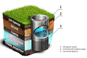 На нижнем конце трубы устанавливается фильтр (перфорация и мелкоячеистая сетка), который очищает воду от песка и мелких примесей.